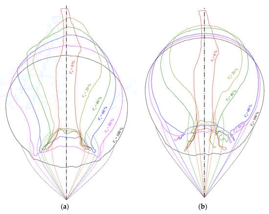 Although the wrinkling and folding patterns of the 1 and 4 m airbags were very similar, several differences were observed between the meridian profiles of the models in two sizes in terms of inflation ratio, as shown in Figure 14. The meridian plane was selected at the same longitude, and lines with various colors represent the shapes at different inflation ratios. The dashed lines under the airbag are the artificial references to indicate the location of the attached straps and mooring points, and they do not represent the actual state of the cross-section. The left-hand figure shows the 1 m model, and the right-hand figure shows the 4 m model. The shapes were captured from the same meridional plane during inflation, and it is convenient to compare their profile variation from the same empty shape ().