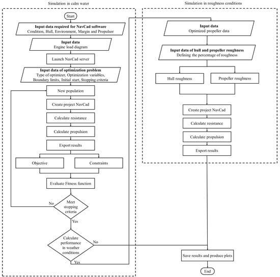 After optimizing the propeller in calm water by taking the standard values of roughness for both hull (15 mm) and propeller (0.03 mm), these values have been changed according to the recommendations of ITTC [47] and of the experts in [23,62], where the propeller roughness is computed for each year. The schematic diagram of the simulation process is presented in Figure 1.