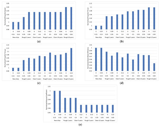 Propeller characteristics at different hull and propeller roughness: (a) propeller speed, (b) propeller thrust, (c) propeller torque, (d) open water efficiency and (e) advance coefficient.