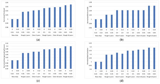 From Table A1, the thrust and torque coefficients as well as the wake fraction and thrust deduction factor of all simulated cases show a very slight reduction, which is not noticed when the values are approximated to two decimal points. This is because these values are assumed constant over ten years of ship operation, following the same concept presented in detail in [64].