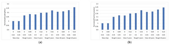 Engine characteristics at different hull and propeller roughness; (a) loading ratio and (b) fuel consumption.
