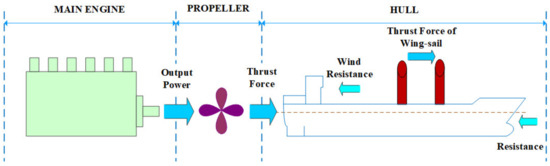In wing sail-assisted ships, the propeller converts main-engine output power into thrust force to propel the ship, and the wing sails also contribute part of the auxiliary propulsion to reduce the output power, thus achieving the purpose of fuel consumption saving. Meanwhile, the ship needs to overcome wind resistance and the resistance composed of static water resistance, additional resistance, added resistance of waves, etc., to achieve normal navigation, as shown in