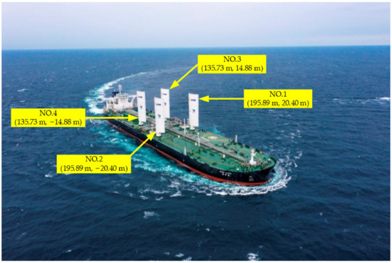 The position and arrangement of the sails have an influence on the energy-saving effect. In ships with the center of transverse resistance located at the bow, the wind propulsion system is usually only applicable to the position where the center of aerodynamic pressure is also located near the bow. Alternatively, the installed wind propulsion system should be kept small enough to keep the side forces and rudder angle quite small. The target ship was equipped with two pairs of wing sails on the main deck. After considering the factors of the bridge visibility requirement of International Convention for Safety of Life at Sea (SOLAS), the ship structural strength, and the ship stability, the wing sails were symmetrically arranged at port and starboard, and their number and positions are shown in
