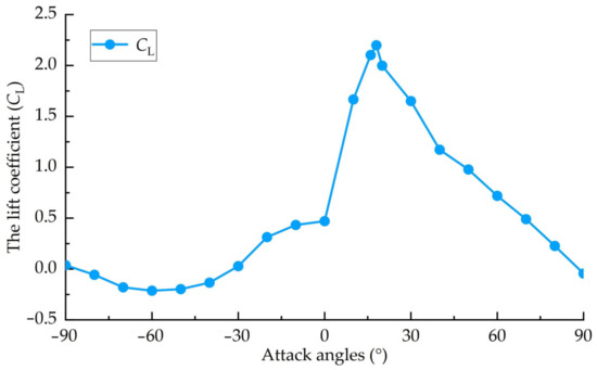 Figure 9, the lift coefficient of the wing sail is negative in the range of −90° to −30°, and it increases in the range of −30° to 18°. The lift coefficient reaches the maximum value of 2.199 at the position of 18°; then, it decreases as the attack angle increases. The lift coefficient greatly varies before and after the attack angle of 0°; the reason is that the convex and concave shapes of the wing sails are different. When the attack angle is in the range of −90° to 0°, the wind comes from the convex surface of the wing sail, while the wind comes from the concave surface in the 0°-to-90° range. The attack angle of 18° is where the maximum lift coefficient occurs; then, with the increase in the attack angle, more and more vortex and boundary layer separation form on the back pressure surface of the wing sail, leading to the gradual decrease in the lift coefficient within the attack angle range of 30° to 90°.