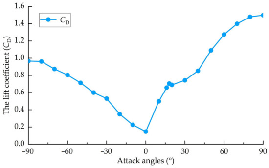 Figure 10, the drag coefficient of the wing sail decreases as the attack angle increases in the range of −90° to 0°, and the drag coefficient increases in the angle range of 0° to 90°. Obviously, as the wing sail rotates, the drag coefficient increases as the wing sail projected area along the wind direction increases.