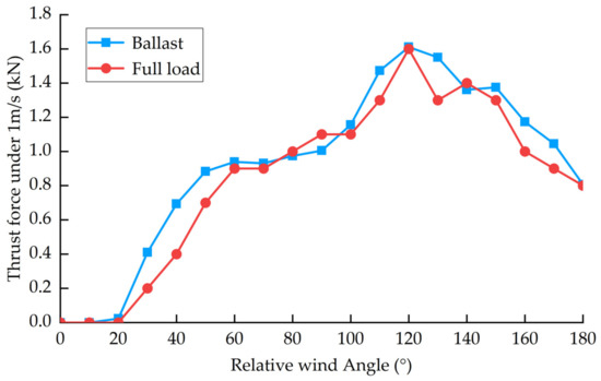 Figure 11, the thrust force under the ballast condition is larger than that under the full-load condition in most relative wind angle ranges. The reason is that the draft under the ballast condition is smaller than that under the full-load condition, which means that the wing sail under the ballast condition is higher than that under the full-load condition with respect to the sea surface and has higher wind speed under the ballast condition. Due to the different interference effects between the wing sails and the ship superstructure under the two loading conditions, the thrust force under the full-load condition is larger than that under the ballast condition when the relative wind angle is from 80° to 95°, as well as around 140°. The range of 0-to-15° relative direction angles does not produce thrusting force, which is an invalid range for wing sails. Due to the symmetrical structure of wing sails, an invalid range also appears at 345°-to-360° relative direction angles.