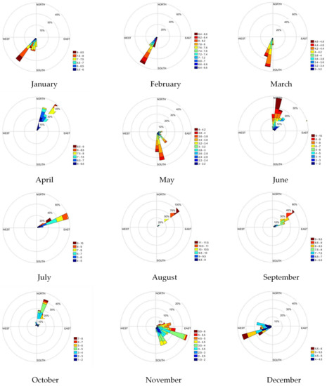 Figure 14, the wind directions in April, June, August, September, and October were distributed within 90° and were lower than those in other months. Both wind speed and direction significantly varied in different months.