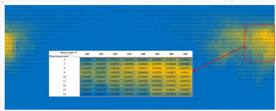 Figure 16, the depth of the yellow color indicates the probability value of the matrix, that is, the deeper the yellow color is, the greater the probability is. Some key data in the matrix (red box area) are enlarged to display the values. The wind field probability matrix data are in
