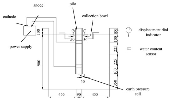 For the top-down electro-osmosis test, as shown in Figure 3, the bottom electrode of the pile was connected to the negative pole of the power supply, and the top electrode of the pile was connected to the positive pole. The bottom of the pile was drilled with many small holes and wrapped with filter cloth. A plastic pumping pipe was set in the cavity of the pile to be used to pump water from pile bottom. The water content sensors were buried at a distance of 5 cm from the pile and a depth of 10 cm, 32.5 cm, and 55 cm, respectively. The water content sensor model was JXBS-3001-TR, the accuracy was 0.1, the probe length was 70 mm, the range was 0~100%, and the working temperature was −40~80 °C. The electromagnetic pulse technology was used to measure the soil water content. The measured data were calibrated with the traditional water content measurement method, and the difference between the two was within 1%. An earth pressure box was arranged at the bottom of the pile. Two displacement meters were symmetrically arranged at the soil surface 5 cm from the pile to measure the soil surface settlement. In order to reduce the influence of water evaporation on the test, the soil surface was sealed with plastic membrane.