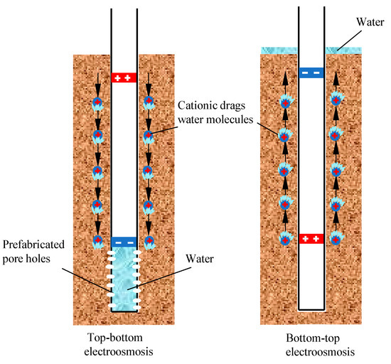 The bottom-up electro-osmosis test and the top-down electro-osmosis test were started at the same time. The cations in the water moved to the cathode with the carried water molecules, As shown in Figure 6. The water content of the soil at the cathode increased, and the water gathered at the cathode was pumped out. During the test, water content sensors were placed at the cathode, anode, and between the cathode and anode of the pile to monitor the water content changing in the soil.