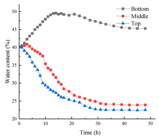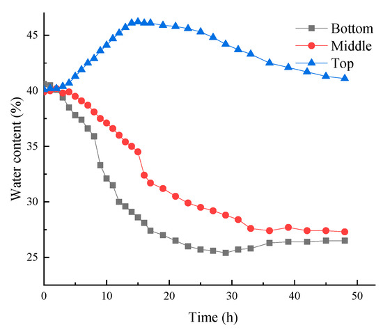 In the top-down electro-osmosis test, the electrode at the bottom of the pile was the cathode, and the electrode at the top was the anode. The water in the soil flowed from the top of the pile to the bottom and entered the inside of the pile through the holes on the pile at the bottom, and the water was extracted from the inside of the pile using the pumping pipe. As shown in Figure 8, in the early 3–15 h stage after the start of electro-osmosis, the water content at the bottom of the pile increased rapidly under the action of electro-osmosis, and the water content at the top of the pile decreased sharply. The water content between the two electrodes decreased after a short rise, because the water at the cathode penetrated into the pile at a limited rate, and the water in the soil at the anode rapidly infiltrated downward, resulting in a slight increase in the water content between the electrodes. In the middle stage of 15–35 h, the change in water content was slight, and the content tended to be stable in the stage of 35–48 h. The water content at the anode was 22.5% in the final, which was reduced by 44.2% compared with the initial water content of 40.3%.