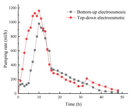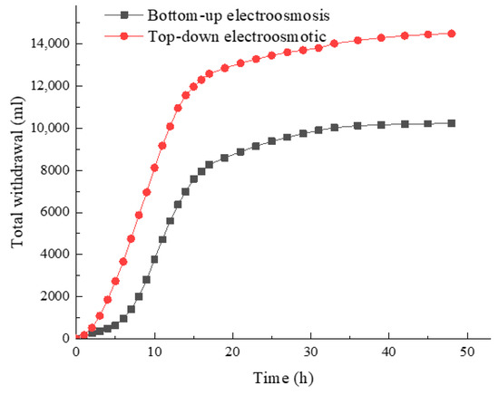 As shown in Figure 9, the electro-osmosis water discharge increased rapidly within 20 h, but became slow thereafter and almost stopped increasing at the end of the experiment. The total amount of water extracted from the top-down electro-osmosis was 41.69% higher than that from the bottom-up experiment. Although the water content of the soil in the two tests was the same, the amount of water discharged by electro-osmosis was quite different. This indicates that the application effects of the two different electro-osmotic methods proposed in this study may be very different in engineering. In the early 0–10 h stage, the amount of water was large; in the middle 10–20 h stage, the amount of discharging water decreased rapidly; in the later stage, the amount of discharging water decreased slowly, and finally tended to 0. In the bottom-up electro-osmosis group, the amount of discharging water was maintained at about 180 mL in the initial stage of electro-osmosis. The reason was that electro-osmosis needed to overcome the gravity of water, so time was taken for the water to go upward to the cathode. At the end of the experiment, the total amount of water pumped from the top-down electro-osmosis group was 14,501 mL, while the total amount of water pumped from the bottom-up electro-osmosis group was 10,234 mL, and the amount of water pumped from the top-down electro-osmosis was 41.69% higher than that from the bottom-up test.