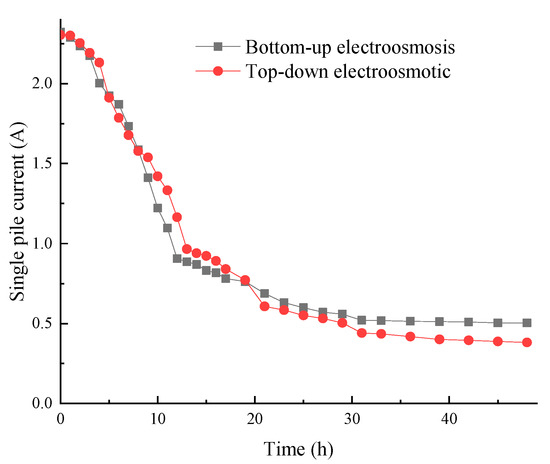 The change in current in the process of the electro-osmosis test can better reflect the change in soil resistance and electro-osmosis energy consumption. Considering the electrical safety of the test, the power supply voltage of the two groups of tests was 36 V, and the initial current was 2.3 A. As shown in Figure 11, during the test, the current changes in the two groups of tests were basically the same. The overall trend was a rapid decline in the early stage, a slow decline in the middle and late stages, and finally tended to be gentle. The reason for this phenomenon was that in the early stage of electro-osmosis, the amount of discharging water and discharging rate were large. With the extraction of a large amount of water in the soil, the interface resistance of the pile–soil interface in the soil increased rapidly, resulting in a rapid decrease in the current in the soil. In the middle and late stages, the amount of discharging water and discharging rate decreased, the interface resistance of the pile–soil interface increased slowly, and the current in the soil tended to be gentle. In the later stage of the test, the current of the bottom-up electro-osmosis group was larger than that of the top-down electro-osmosis group. The reason was that in the later stage of the bottom-up electro-osmosis group, due to the large interface resistance of the pile–soil interface and the small electro-osmosis current, a part of the water in the soil could not overcome its own gravity to flow upward, so there was more water remaining in the soil, resulting in a larger current in the final soil. After the end of the experiment, the current of the bottom-up electro-osmosis group was 0.504 A, and the percentage of decline was 78.1%; the current of the top-down electro-osmosis group was 0.382 A, and the percentage of decline was 83.4%. The decline was greater in the latter.