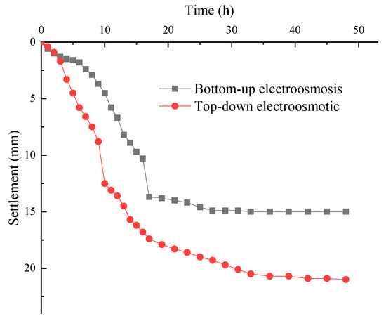 The soil surface settlements are shown in Figure 12. In the two groups of tests, the soil settlement in the early stage of the test was large, and the settlement in the middle and late stages of the test gradually decreased. In the 0–10 h stage of the bottom-up test group, soil settlement was not obvious. The reason was that the water in the soil moved from bottom to top, causing a slight uplift in the soil. When the water content decreased, the soil began to have a more obvious settlement. The test proved that the final settlement of the bottom-up electro-osmosis group was 15.12 mm, while the final settlement of the top-down electro-osmosis group was 21.32 mm, and the settlement was larger, with an increase of 41.00%. The electro-osmosis flow in soft clay was conducive to accelerating the discharge of water in the soil and speeding up the consolidation process of the foundation. In this process, due to the large loss of water in the soil, the foundation settled, causing the pile to settle together with the soil.