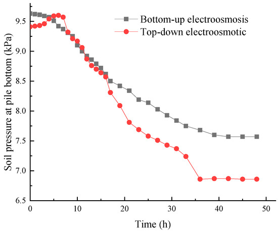 The change in earth pressure at the bottom of the pile during the electro-osmosis test was monitored by installing an earth pressure cell at the bottom of the pile. As shown in Figure 13, the soil pressure at the pile bottom of the two groups of tests generally showed a downward trend. The rate of decline was fast in the early stage and slow in the later stage, and gradually slowed down to the same in the later stage. In the early 5–10 h stage, the soil pressure at the bottom of the pile in the top-down electro-osmosis group increased. The reason was that the soil around the pile settled rapidly during the electro-osmosis process, and the soil around the pile produced a downward negative friction resistance to the electro-osmosis pile, which increased the soil pressure at the bottom of the pile. With the continuous extraction of water in the soil, the upper weight decreased, and the soil pressure at the pile bottom decreased. After the test, the soil pressure at the bottom of the pile in the top-down electro-osmosis group was 6.86 kPa, and the soil pressure at the bottom of the pile in the bottom-up electro-osmosis group was 7.57 kPa, indicating that the electro-osmotic drainage in the top-down electro-osmosis group was greater.
