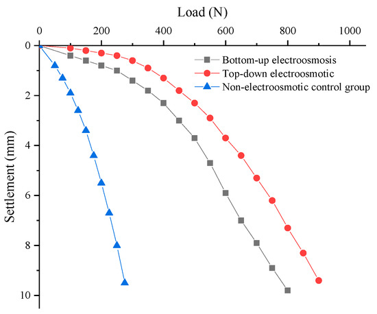 As shown in Figure 14, the ultimate bearing capacity of the pile in the bottom-up electro-osmosis group was 755.6 N, the ultimate bearing capacity of the pile in the top-down electro-osmosis group was 881.8 N, and the ultimate bearing capacity of the control group without electro-osmosis was 240.8 N. In this test, vertical electro-osmotic flow effectively increased the bearing capacity of pile foundations in muddy clay by about 3–4 times. In practical engineering, due to the size and bearing capacity of the pile being often relatively large, vertical electro-osmosis might not be able to improve the bearing capacity of the pile so much, but it was certain that electro-osmosis could significantly improve the bearing capacity of the pile. Moreover, it was found that the electro-osmosis effect from top to bottom was better, and the bearing capacity of the pile was about 16.70% higher than that of the bottom-up electro-osmosis group.