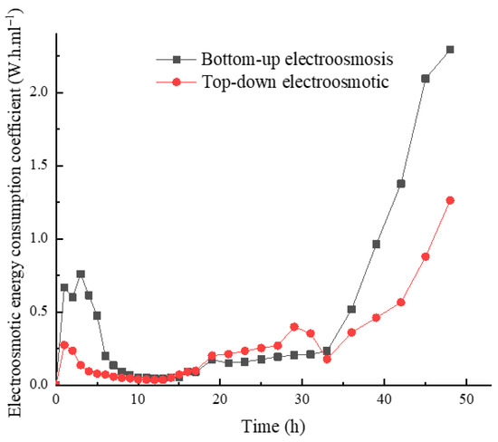 As shown in Figure 15, the electro-osmotic energy consumption coefficients of the two groups of experiments were generally high in the early stage, decreased in the middle stage, and increased rapidly in the later stage. The average electro-osmotic energy consumption coefficient of the bottom-up electro-osmosis group was higher, indicating that the electro-osmosis efficiency of the bottom-up electro-osmosis group was lower. The reason was that in the early stage of the test, the water in the soil of the bottom-up electro-osmosis group moved upward, and the time required was longer, resulting in a small amount of water discharging at this stage, and the electro-osmotic energy consumption coefficient was large. In the middle stage, because of the large amount of water discharging, the electro-osmotic energy consumption coefficient was small. In the later stage, as the water content in the soil decreased, the amount of water discharging decreased, and the resistance of the pile–soil interface increased, the current decreased, and the electro-osmotic energy consumption coefficient increased rapidly. The changing trend of the energy consumption coefficient shows that too long an electro-osmosis time will lead to excessive energy consumption by electro-osmosis, so the electro-osmosis time should be reasonably controlled in practical application.