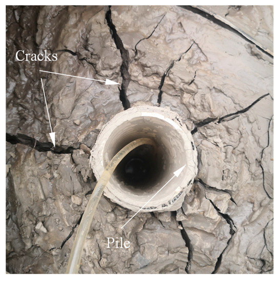 During the test, a large number of mesh cracks were generated in the soil around the pile, and the cracks developed around the pile, as shown in Figure 16. Compared to the bottom-up electro-osmosis group, the cracks in the top-down electro-osmosis group appeared earlier, were greater in number, wider in width, and faster in development. The cracks in the bottom-up electro-osmosis group developed from the lower part to the upper part, which was almost invisible in the early stage. Soil shrinkage and cracks are common phenomena in electro-osmosis, especially at the anode. These cracks can be compensated by post grouting.