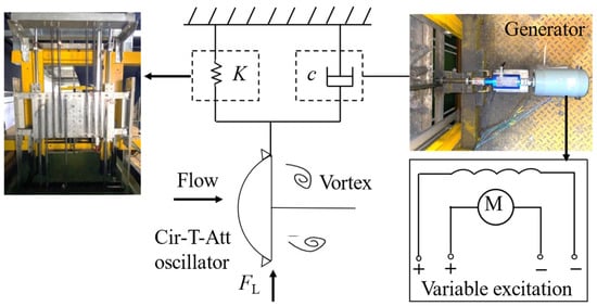 As summarized above, it can be seen that both the flow-induced motion of circular cylinders and non-circular cylinders are sensitive to the effect of Reynolds number; the summary of a representative investigation of Reynolds number effect on vortex induced vibration is summarized in Table 1. So far, the studies of the flow regime around a circular cylinder are relatively complete at different Reynolds numbers, while the understanding of the wake pattern and vibration response of noncylinders in different Re number ranges is far from systematic and in-depth. Meanwhile, in our previous studies on different combined cross sections [], we found that the Cir-T-Att oscillator has a great advantage in flow-induced motion energy harvesting, so this study is related to the Cir-T-Att oscillator under different Reynolds numbers. In the present study, experiments are conducted in a recirculating water channel, and the controllable magnetic damping system is applied to examine the effect of system damping on the output power and system efficiency under different Reynolds numbers.