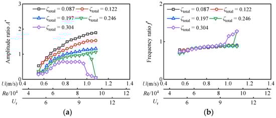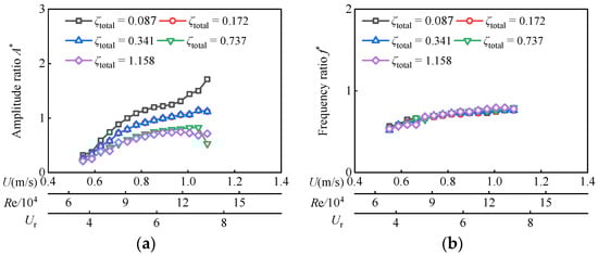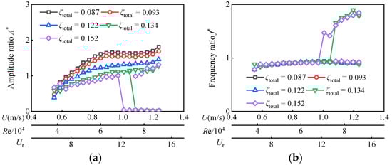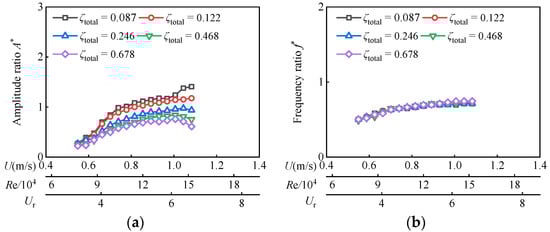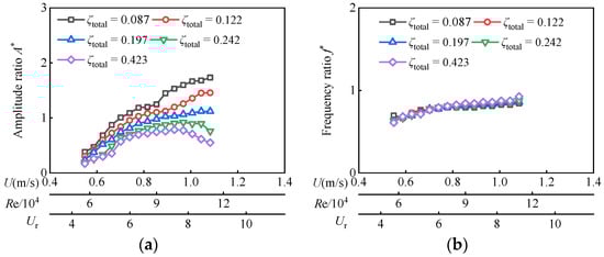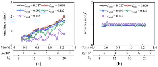 In Figure 5, the current velocity U is from 0.55 m/s to 1.24 m/s, the reduced velocity Ur ranges from 8.89 to 19.98, and the corresponding Reynolds number Re varies from 2.89 × 104 to 6.51 × 104 for D = 0.06 m. In this Reynolds number range, as ζtotal ≤ 0.122, A* overall trend continues to increase, while f* tends to stabilize at about 0.9. With the increase in Reynolds number, the oscillator successively enters VIV branches and VIV-Galloping transition branches, but galloping branches are not fully developed. The maximum amplitude ratio A*max is 2.02 and appears at Re = 6.51 × 104 (Ur = 19.98) with ζtotal = 0.087.