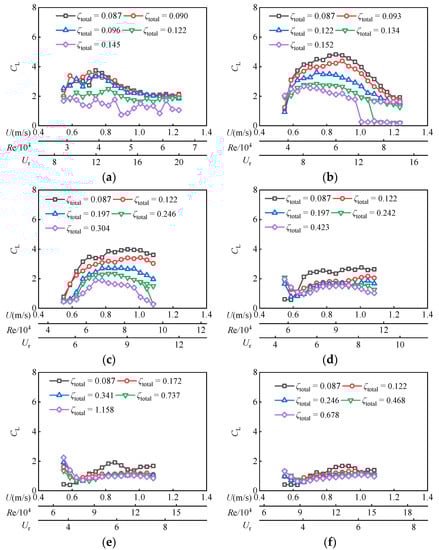 As shown in Figure 11a–f, variations of the lift coefficient CL with the Reynolds number Re and total damping ratio ζtotal are illustrated. For D = 0.06 m, CL shows an increasing trend with the increase of Re in the VIV branches. As Re keeps on increasing, CL shows a decreasing trend in the VIV-Galloping transition branches. It may be because, with the increase in attack angle α, CL increases before the fluid boundary layer is separated. The angle of attack continues to increase, until it exceeds the critical value.