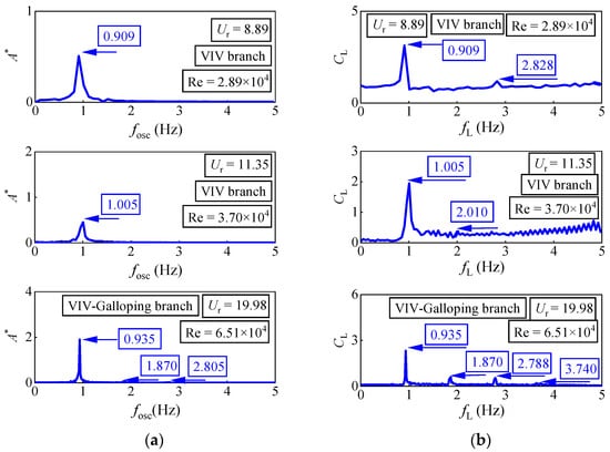 In the third range, Re = 6.51 × 104 (Ur = 19.98), the following observations are made: a prominent peak (fosc = 0.935 Hz) and a small peak (fosc = 1.870) in the displacement spectra are observed, and there are 4 peaks (fL = 0.935 Hz, fL = 1.870 Hz, fL = 2.788 Hz, and fL = 3.740 Hz) in the force spectra. Referring to the results of Ding et al. and Zhang et al. [,] and combining with the spectra curve obtained from the test, the wake vortex shedding mode of the oscillation in the range before jumping from the VIV upper branch to the galloping branch is inferred. In the displacement spectra, the second and third harmonic components of the oscillation frequency are observed, and the vortex structure is in the combination mode of 2P and P + S or the combination mode of 2P and 2S.