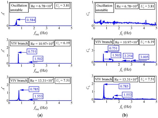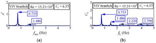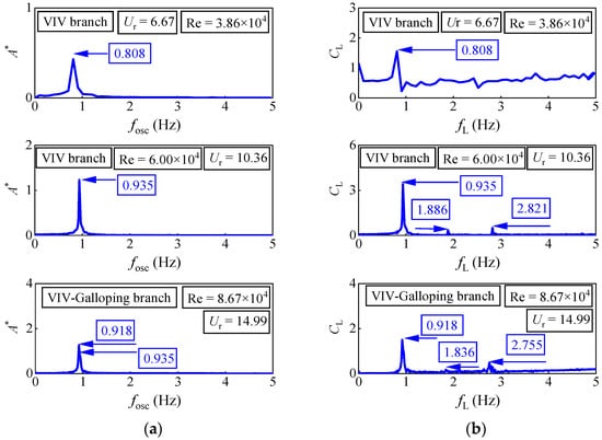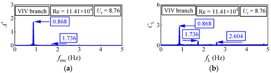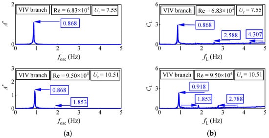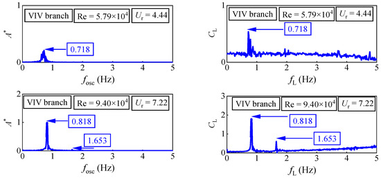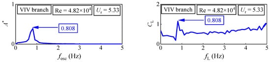 The spectral content of six oscillators under three different reduced velocities Ur is observed: For D = 0.06 m, the Re = 2.89 × 104 (Ur = 8.89) is in the VIV branch. There is a prominent peak (fosc = 0.909 Hz) at the first harmonic component of the oscillation frequency. Additionally, in the fluid force spectra, two peaks, fL = 0.929 Hz and fL = 2.828 Hz, are observed at the first harmonic component and the third harmonic component, respectively. In the second range, the Re = 3.70 × 104 (Ur = 11.35) is also referring to the range of the VIV branch. In displacement spectra, only a prominent peak (fosc = 1.005 Hz) is observed at the first harmonic component of the oscillation frequency. There are two peaks, fL = 1.005 Hz and fL = 2.010 Hz, at the first harmonic component and the second harmonic component, respectively. These results corroborate the ideas of Raghavan []. In the VIV branch, the main frequency of oscillation is obvious and there is no higher harmonic, which indicates that the fluid is vortex shedding in 2S mode, that is, there is a vortex shedding at the position where the oscillator runs to the maximum displacement of positive and negative. Its force mechanism is that the periodic lifting force caused by vortex shedding drives the oscillator to oscillate.