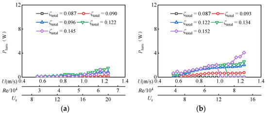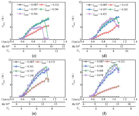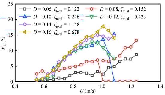 For D = 0.06 m, D = 0.08 m, and D = 0.10 m, the upper limit of harvested power output PUL increases continuously with the Reynolds number Re increasing. While for D = 0.12 m, D = 0.14 m, and D = 0.16 m, the PUL increases with the Re until an optimal value and then decreases. This inconsistency may be because of the vibration response in different branches. Referring to Section 3.1, in the present experiment condition, for D = 0.06 with ζtotal = 0.122, the oscillation undergoes VIV branches and VIV-Galloping transition branches, and its maximum PUL reaches 8.75 W, appearing at Re = 6.51 × 104. For D = 0.08 with ζtotal = 0.152, the oscillation can be induced on a galloping branch, and its maximum PUL reaches 13.25 W, appearing at Re = 16.22 × 104. For D = 0.10 and ζtotal = 0.246, the VIV lower branch cannot enter the galloping branch. Its maximum PUL reaches 15.27 W appearing at Re = 9.51 × 104. As D = 0.12 with ζtotal = 0.423, D = 0.14 with ζtotal = 1.158 and D = 0.16 with ζtotal = 0.678, all of the oscillations enter into VIV branches. Their maximum PUL are 12.83 W (Re = 9.80 × 104), 14.73 W (Re = 13.31 × 104) and 17.80 W (Re = 15.21 × 104) respectively. It is noted that even the optimal total damping ratio of D = 0.14 m is higher than that of D = 0.16 m, but the PUL of D = 0.16 m is larger than that of D = 0.14 m. The larger the characteristic width D of the oscillator, the higher the generating power of FIMECS. It can be seen that increasing the Re number range of the oscillator is conducive to improving the capacity of a single unit of a FIMECS. This is because the larger the Re number is, the larger the maximum system damping ratio that can be overcome by the oscillator is, and the larger system damping ratio is conducive to improving the generating power of the FIMECS.