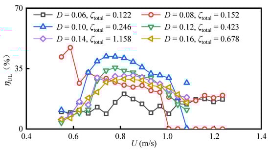 The effect of Re on the upper limit of power output efficiency is also clearly evaluated in Figure 20. The ηUL first increases with the velocity and then decreases. While the change of ηUL with the Reynolds number is not regularly, these results seem to be due to the power in the current flow Pw varying with the cube of velocity U3. More power does not mean high efficiency. As derived in Equations (11) and (12), when the power available in the flow Pw dominates the variation of efficiency ηUL, even if PUL undergoes a steady increase, ηUL may remain unchanged or even decline. In our test, the maximum ηUL of Cir-T-Att reaches 42.11%, appearing at D = 0.1 m, ζtotal = 0.246, and Re = 6.49(Ur = 7.18, U = 0.74 m/s).