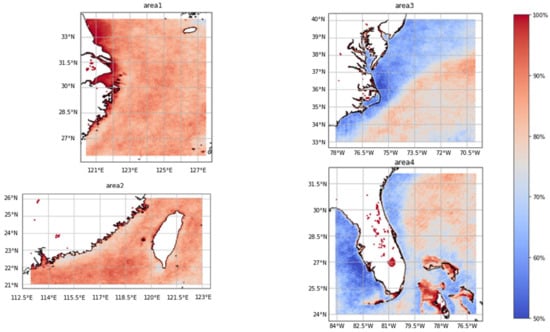 Missing rates of all these areas are calculated at each pixel and shown in Figure 2. The majority of the pixels have missing rates higher than 50%. The Missing rate in the East China Sea and the South China Sea is higher than that in the East Coast and Florida, especially in the Coastal region where the data loss rate is close to 100%. This difference may be due to differences in satellite coverage and cloud density between the two continents. To make the results more reliable, images with valid pixels less than 2% are not used, referring to the previous study [28]. Finally, 3277 images in area1, 3639 in area3, and 3565 in area4 were selected as a bulk dataset. The bulk dataset was then divided into a training set, a validation set, and a test set in the ratio of approximately 8:1:1. Images in area2 are only for testing and 10% (321) of valid images were selected randomly as a separate test set.