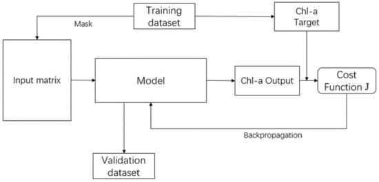 Figure 4 illustrates the workflow of how each model is trained. Firstly, Chl-a images from the training set are masked artificially and more data is masked out. This research creates an artificial mask dataset, containing 100 masks for each region. Each mask is extracted from the missing position of a real daily Chl-a image, where 1 denotes the pixel is missing and 0 denotes the pixel is valid. The masking process is performed by multiplying the original Chl-a matrix by . The masked 2D Chl-a matrix is combined with other auxiliary variables to create a 3D input matrix. The variables used in the input matrix are shown in Table 1. The model uses the 3D input matrix to generate a 2D Chl-a reconstruction. Initially, all parameters in the model are assigned random values and the reconstruction is poor. The reconstruction () and true Chl-a observation () are taken as the input of the cost function given in the equation below: