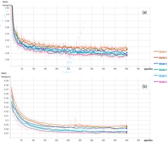 RMSEs of these six models during the training process for both the training and the validation sets are shown in Figure 7. The RMSEs in this phase are calculated as follows:
