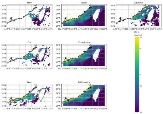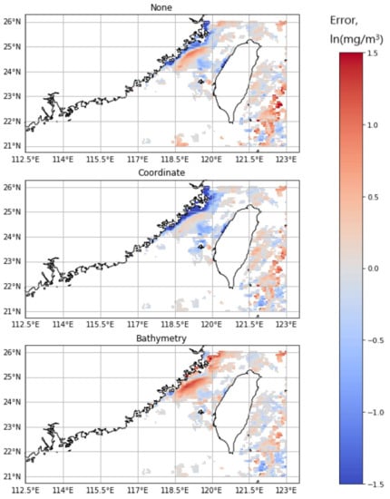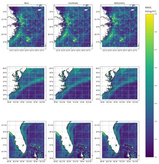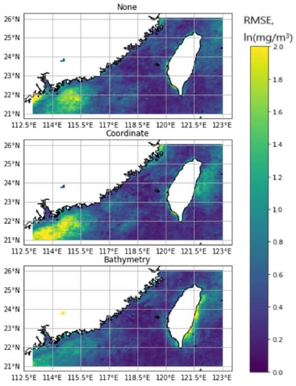 Figure 11 presents the RMSE of three models for each pixel in the test set. The model without auxiliary parameters and the model with coordinate input have high RMSE in the southwest, close to the Pearl River Estuary, on the western coast of Taiwan island, and nearby another estuary in the north. The model with bathymetry input has significantly lower RMSEs near estuaries and on the western coast of Taiwan island than the other two models. However, it has a high RMSE on the eastern side of Taiwan island, possibly due to the region’s distinct landscape characteristics that differ from those of the areas used for training. While the coasts in training areas are all gentle planes with high Chl-a concentration, the east coast of Taiwan island is a steep mountain area close to the continental shelf with a low Chl-a concentration. Incorrectly inferring the low Chl-a value area as a high Chl-a area may lead to a 1000% overestimation. Since the error of logarithmic values evaluates the relative error and RMSE amplifies the higher errors, this false inference for the east coast of Taiwan land contributes to the overall RMSE greatly. This could be solved by incorporating such bathymetry in training data.