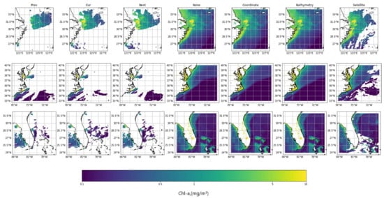 Figure 9 displays the reconstruction results of each model for specific days. Data from the test set in area1 on 11 June 2013, in area3 on 7 October 2020, and in area4 on 20 February 2011 was used for reconstruction. The white areas in the last column (Satellite) are missing pixels where . The second column (Cur) is generated by multiplying the original satellite observed Chl-a matrix by , hence the white space in the second column are invalid pixels, where . The first (Prev) and the third (Next) columns are the Chl-a of the previous day and the next, after artificial masks. The figure shows that there is no significant difference between the three models’ reconstruction results and all the three models can reconstruct the Chl-a patterns reliably in the training areas. Although they tend to blur fine structures generated by short-term ocean dynamics.