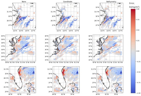 Errors at each pixel are calculated and shown in Figure 13. The model without auxiliary input and the one with coordinate input both have a large negative error on the northern coastal area, due to failure to reconstruct the high Chl-a value near the coast. In contrast, the model with bathymetry input has a much lower error in the same area, although it has a large positive error farther from the coast, due to overextending the scope of high Chl-a. The same advantage due to bathymetry input occurs on the west side of Taiwan island. Furthermore, the last model has a lower error in the open ocean on the east. In summary, the reconstruction error of the model with bathymetry input is slightly lower on a global scope and significantly lower in coastal areas than the other two models.