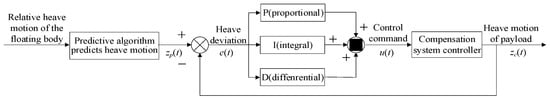 where is the control command output of the controller and the input vector of the heave compensation system shown in Equation (2); , and are the proportional gain, integral gain and differential gain, respectively; is the deviation signal; and is the time duration of the whole control process. The discrete form of the numerical simulation process is expressed as