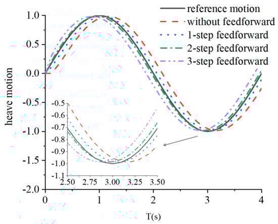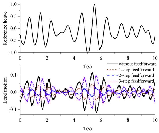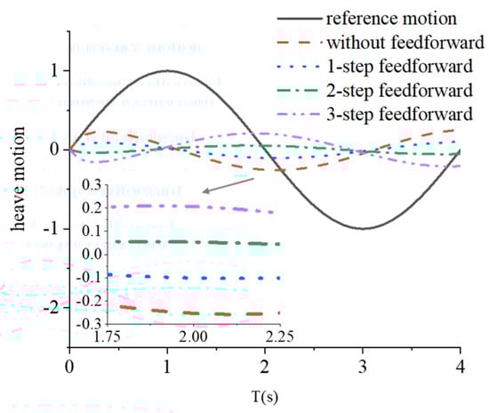 The heave motions of the payload that can be compensated by feedforward control are shown in Figure 6. When the reference motion is normalized to [−1, 1], even in the worst cases (cases without feedforward and three-step feedforward control), the amplitudes decreases to about 30%. Comparison of the phase shift shows no significant difference between the one-step and two-step feedforward control. However, the amplitude of load heave motion in the two-step feedforward case is almost half of that in the one-step feedforward case. When the phase shift changes from lagging to ahead, the peak appears in a certain moment, such as 2.0 s, and is then converted to a valley. Overall, in consideration of both phase shift and amplitude reduction, two-step feedforward control with actual-data future information is the best choice for the proposed heave compensation system.