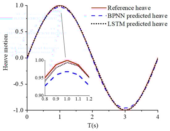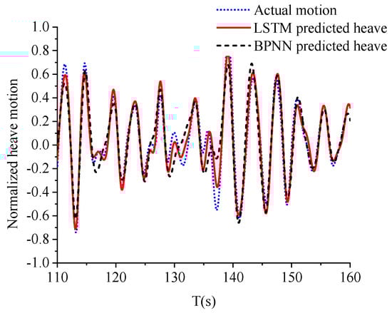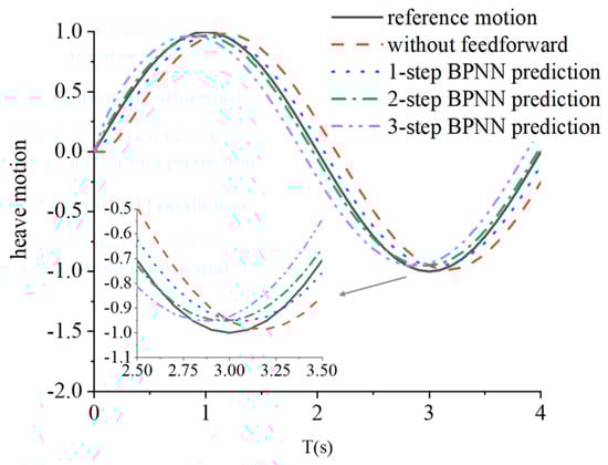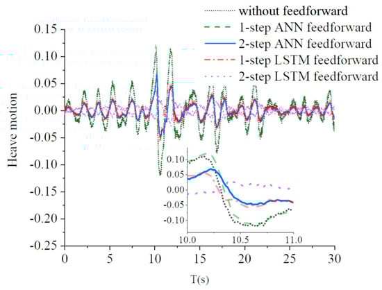 In the case of irregular structure heave motion, the BPNN prediction does not meet the accuracy requirement as well as it does in the regular motion cases. The advanced machine learning algorithm, namely, LSTM RNN, is also implemented to predict the future motion in a feasible manner. Two pairs of curves almost overlap in Figure 15. The first pair is the one-step BPNN feedforward case and the case without feedforward (feedback). A possible reason for this overlapping phenomenon is the inaccurate prediction of the BPNN algorithm. Irregular motion is a complex time series variation for BPNN. Therefore, a simple BPNN model is expected to unsuccessfully predict the next step motion, but its result is close to the current step motion. Thus, the curves overlap because they have almost the same input. The second pair is the two-step BPNN feedforward case and the one-step LSTM RNN feedforward case. From another indirect aspect, the LSTM RNN prediction motion is proven accurate.