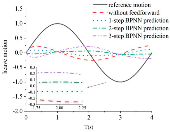 The actual-data feedforward control analysis shows that two-step feedforward control is the best option. The next step is to determine how proximate predictive machine learning algorithms influence the performance of the control system. Although the two-step feedforward case is the optimal choice when the future information is actual, whether that conclusion is affected when the future information is predicted remains unknown. The actual-data and prediction cases with the same feedforward steps are called corresponding cases. In this study, the future motion is predicted based on two machine learning algorithms: BPNN and LSTM RNN. As shown in Figure 7, BPNN prediction has the same accuracy as LSTM prediction. No significant difference is observed between BPNN and LSTM RNN prediction motions for a single harmonic motion. However, the trade-off between time consumption and accuracy is considered here because BPNN is less time-consuming than LSTM RNN. Thus, in the regular structure motion section, only the BPNN prediction results are discussed, but the discussion is suitable for LSTM prediction.