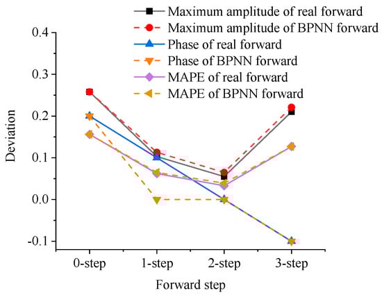 Except for the case where the phase lag of one-step prediction is smaller than that of the one-step actual-data feedforward case, the other corresponding cases have the same lagging step number. MAE and RMSE initially decrease and then increase, and they present the same tendency as the maximum amplitude. A comparison of these deviations is shown in Figure 10. The analysis of the deviations shows that replacing the actual motion with the well-predicted motion is feasible when the future information is unknown.