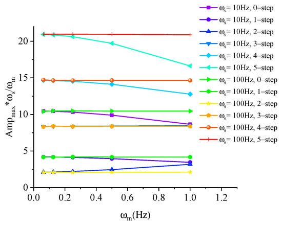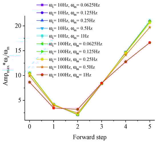 As shown in Figure 11, when forward step number rises from 0 to 1, the maximum amplitudes of payload motion decrease to 40% for all frequencies of structure motion. The reduction in the maximum amplitude is only 20% from 1 step to 2 steps in the case of the 0.0625 Hz structure motion, and this ratio increases to 36% if the frequency of structure motion is 1 Hz. When the frequency of structure motion increases, the motion varies more quickly than it does under a low frequency. Therefore, the control feedback does not compensate for as much motion as the low-frequency cases do. From the two-step to five-step cases, the payload motions increase in a linear manner. For the four-step and five-step cases, the amplitudes of load motion exceed that of feedback control. In the case of = 100 Hz and = 1 Hz, the amplitudes of the one-step and two-step cases are almost equal.