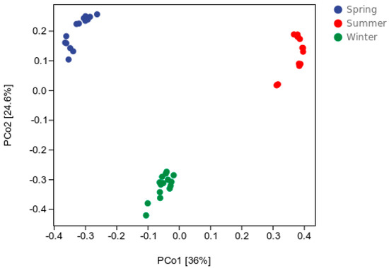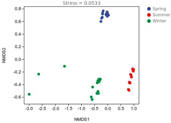 Chao1 confirmed that the taxon richness increased from spring to winter. Differences in the Shannon values between samples in different seasons were determined using a t-test (Table 3). The Shannon value showed an upward trend from spring to winter, which was the same conclusion as the Chao1 values; however, there was no significant difference between the different seasonal samples (p > 0.05). The observed species demonstrated that bacterial diversity increased from spring to winter (p < 0.01).