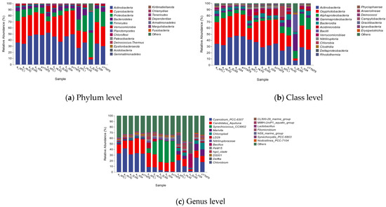 Proteobacteria showed an opposite seasonal trend to Actinobacteria: its relative abundance decreased from spring (11.38%) to summer (6.19%) and increased in the winter (26.26%). In Proteobacteria, the seasonal average relative abundance at the class level showed that Alphaproteobacteria (7.87%, 3.39%, and 15.13%) and Gammaproteobacteria (2.78%, 1.99%, and 10.32%) were the major components. Alphaproteobacteria and Gammaproteobacteria showed the same trend, decreasing from spring to the summer and then increasing in the winter. Proteobacteria (Alpha, Gamma, and Delta) have diverse metabolic pathways that are critical for nutrient cycling, conversion, and the remineralization of substances such as organic carbon and nitrogen [26,27,28]. Alphaproteobacteria is generally abundant in marine waters [29,30]. Figure 4b shows relatively small differences in the abundance of Alphaproteobacteria across the seasons. Previous studies have shown that Gammaproteobacteria plays an important role in denitrification and phosphorus removal [31,32]. The results of the Pearson correlation analysis show that Alphaproteobacteria exhibited a negative correlation with T, NO3−, and NO2− (p < 0.05), Gammaproteobacteria was only negatively correlated with T (p < 0.05, Supplementary Table S3).