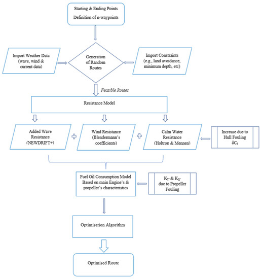 The loading condition, ship speed, and heading are among the parameters that influence fuel oil consumption during transit. Optimal route selection is therefore a process that combines all these parameters under certain constraints with the aim to lower fuel costs and emissions. In [7], a method to predict voyage duration and CO2 emissions was proposed while considering safety and environmental aspects. Speed loss is taken into consideration, pointing out its influence on fuel oil consumption. In Kytariolou and Themelis [8], a new weather routing tool was presented. The tool aimed to calculate the optimal path, in terms of fuel oil consumption, while considering weather forecast data and predefined safety criteria. It is well known that environmental factors affect fuel oil consumption and the safety of the voyage. In [9], the three-dimensional modified isochrone (3DMI) method was applied to solve the ship routing problem considering environmental elements such as wind, wave, and ocean currents. Optimization was performed following two different strategies—estimated time of arrival (ETA routing) and minimum fuel oil consumption (FUEL routing)—along with different constraints. Results show that when aiming to reduce fuel oil consumption, the optimal path requires more time and distance to be travelled in comparison with ETA routing. In addition, when safety constraints are also considered in the optimization process, for both cases, total fuel oil consumption and voyage duration are negatively impacted. Kurosawa et al. [10] developed a new routing system based on the A* algorithm, targeting coastal seas. The optimization considered the shortest distance, the minimum travelling time, and the minimum fuel oil consumption. Atmospheric and oceanic data were considered—whenever the data were updated, the optimal trajectory was recalculated. In addition, Shin et al. [11] proposed an improved A* algorithm to find the optimal path for economical ship operations. The improved method was based on an adaptive grid system, reducing exhaustive calculations required by the original A* algorithm. The validity of the new method was highlighted via a presented case study, where the original and improved methods were both utilized.