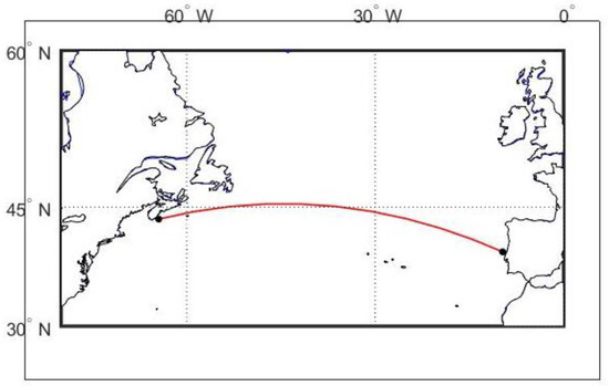 For demonstration purposes, the selected ship is a containership, for which its basic characteristics are shown in Table 1, while the propeller’s characteristics needed for the calculations are shown in Table 2. The chosen route is between Europe and North America. The port of departure is the port of Lisbon (Portugal), whereas the port of arrival is the port of Halifax (Canada, Nova Scotia). In Figure 2 the corresponding orthodrome path between the ports of departure and arrival is shown. Optimization has been performed for several cases representing different hull and propeller fouling conditions, described below as cases 1 to 5. In addition, the ship’s speed, and specifically the commanded SOG, is assumed to be constant and equal to 18 kn: