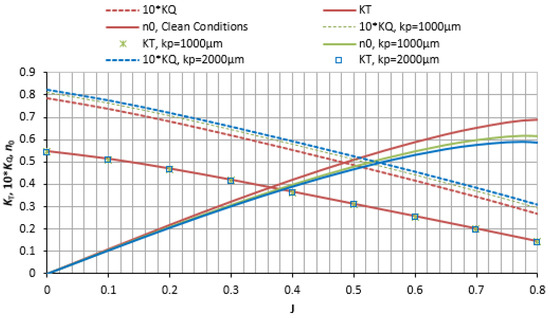 In Figure 3, the effect of the propeller’s fouling on the propeller’s characteristic curves is shown for Case 4 and Case 5 (kp = 1000 μm and kp = 2000 μm, respectively) compared with the respective curves corresponding to the clean condition of the propeller.