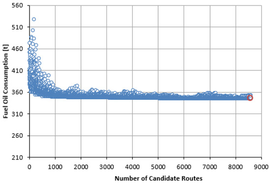 For all cases, the journey starts on 23 February 2019 at 21.00, and optimization is performed for four waypoints utilizing a genetic algorithm embedded in MATLAB [27] with one hundred generations and one hundred populations each. An example of the algorithm’s evolution that corresponds to the clean hull and propeller (Case 1) is shown in Figure 5, where the red circle indicates the optimal route. Some routes were neglected from the process and characterized as unfeasible because they violate the land avoidance principle.