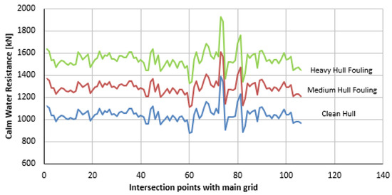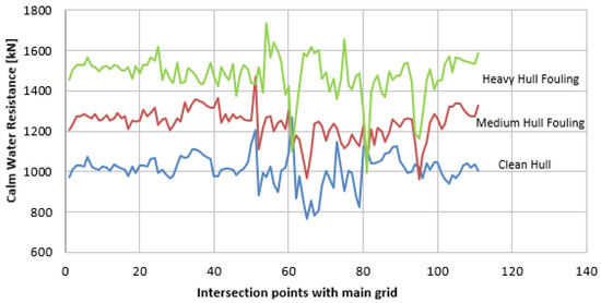Calm water resistance corresponding to optimum paths for different hull fouling conditions.