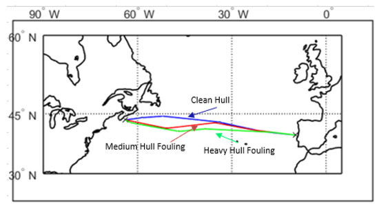 Route planning procedures for ocean-going vessels depend significantly on prevailing weather conditions, the ship’s design characteristics and the current operational state of the vessel. The operational status considers hull and propeller fouling, which significantly affects fuel oil consumption coupled with route selection. The current paper examines the effect of the fouling level on the selection of the optimized route compared with the clean hull/propeller as well as the orthodrome/loxodrome route. A developed weather routing tool is utilized, which is based on a physics-based model for the calculation of the main engine’s fuel oil consumption enriched to account for different fouling levels of the hull and the propeller. A genetic algorithm is employed to solve the optimization problem. A case regarding a containership in trans-Atlantic transit using forecasted weather data is presented. The effect of ocean currents is also examined as it was derived that they greatly affect route selection, revealing a strong dependence on the level of fouling. Ignoring the fouling impact can result in miscalculations regarding the estimated fuel oil consumption for a transit. Similarly, when ocean currents are ignored in the route planning process, the resulting optimal paths do not ensure energy saving.
