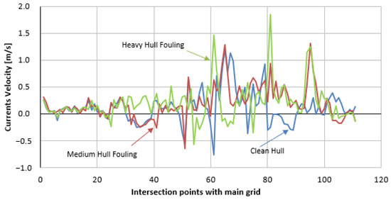 Currents’ velocity along the optimal paths for different hull fouling conditions.